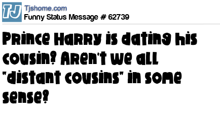 - # 62740 In the news today: Prince Harry is dating his cousin!! I also would be dammned first before I let anyone else date my cousin if she was that good looking.