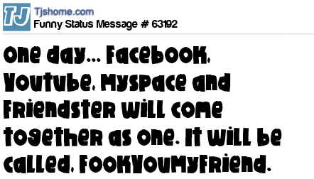 X One day... Facebook, Youtube, Myspace and Friendster will come together as one. It will be called, FookYouMyFriend.