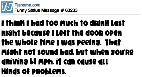 - # 49242 I should have known that I had to much to drink tonight because I left the door open the whole time I was peeing. It might not sound that bad, but when you're driving 65 mph, it can cause all kinds of problems..