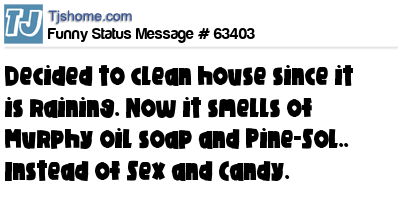X says decided to clean house since it is raining. Now it smells of Murphy oil soap and Pine-Sol.. Instead of Sex and Candy.