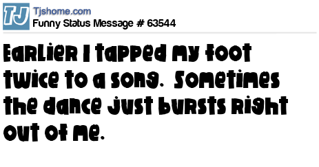 X Earlier I tapped my foot twice to a song. Sometimes the dance just bursts right out of me.