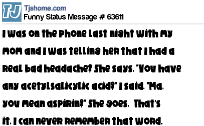 X says I was on the phone last night with my mom and I was telling her that I had a real bad headache? She says, "You have any acetylsalicylic acid?" I said, "Ma, you mean aspirin?" She goes, “That's it, I can never remember that word.”