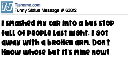 X I smashed my car into a bus stop full of people last night. I got away with a broken arm. Don't know whose but it's mine now!