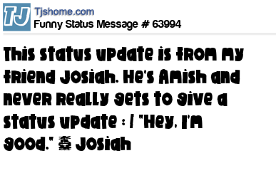 X This status update is from my friend Josiah. He's Amish and never really gets to give a status update : / "Hey, I'm good." ~ Josiah