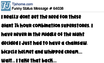 X I really dont get the need for these giant 24 hour combination superstores. I have never in the middle of the night decided I just had to have a chainsaw, bicycle helmet and whipped cream.... wait... I take that back....