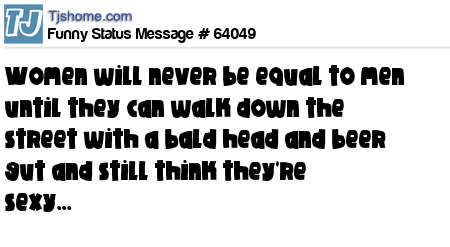 - # 25868 Women will never be equal to men until they can walk down the street with a bald head and a beer gut, and still think they are sexy.