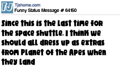 X says Since this is the last time for the space shuttle, I think we should all dress up as extras from Planet of the Apes when they land
