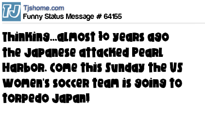 X is thinking...almost 70 years ago the Japanese attacked Pearl Harbor. Come this Sunday the US Women's soccer team is going to torpedo Japan!