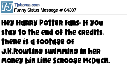 - # 64295 Hey Harry Potter fans: If you stay to the end of the credits, there is a footage of J.K.Rowling rolling around in a pile of money, then snorting it.