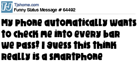 - # 64600 My phone automatically wants to check me into every bar we pass! I guess this thing really is a smartphone.