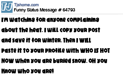 X is I'm watching for anyone complaining about the heat. I will copy your post and save it for winter. Then I WILL paste it to your profile with WHO IS HOT NOW when you are buried snow. OH you know who you are!