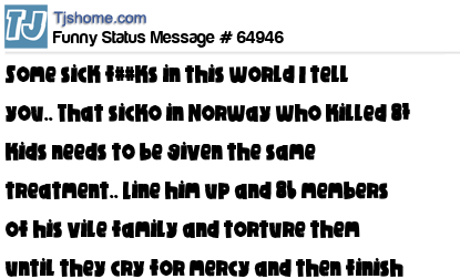 X says Some sick f##ks in this world I tell you.. That sicko in Norway who killed 87 kids needs to be given the same treatment.. Line him up and 86 members of his vile family and torture them until they cry for mercy and then finish them off.