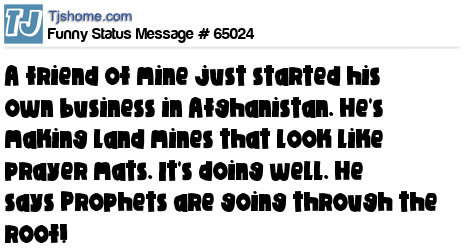 - # 141024 My friend has just started his own business manufacturing landmines that look like prayer mats. Apparently, prophets are going through the roof.