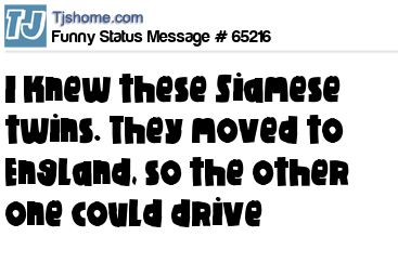 - # 147403 Why did the Conjoined Twins move to England? So the other one could drive.