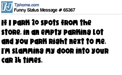 X is If I park 20 spots from the store, in an empty parking lot and you park right next to me, I'm slamming my door into your car 34 times.