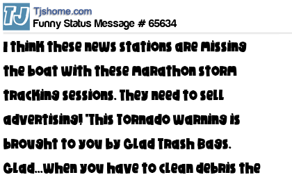 X I think these news stations are missing the boat with these marathon storm tracking sessions. They need to sell advertising! "This Tornado warning is brought to you by Glad Trash Bags. Glad...when you have to clean debris the next morning, don't get mad..