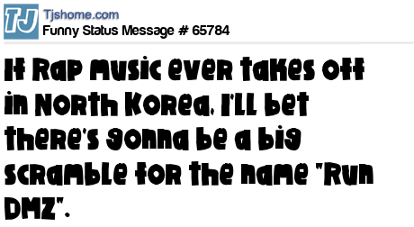 X is If Rap music ever takes off in North Korea, I'll bet there's gonna be a big scramble for the name "Run DMZ".