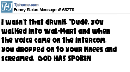 X says I wasn't that drunk. "Dude, you walked into Wal-Mart and when the voice came on the intercom, you dropped on to your knees and screamed, “GOD HAS SPOKEN”