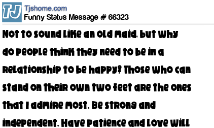 X says Not to sound like an old maid, but why do people think they need to be in a relationship to be happy? Those who can stand on their own two feet are the ones that I admire most. Be strong and independent. Have patience and love will come.