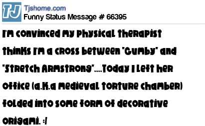 X I'm convinced my physical therapist thinks I'm a cross between "Gumby" and "Stretch Armstrong"....Today I left her office (a.k.a medieval torture chamber) folded into some form of decorative origami. :/