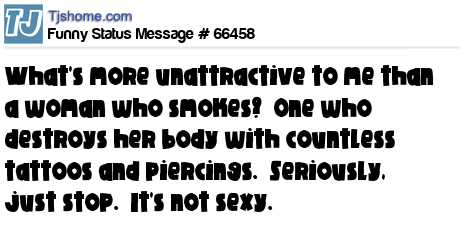 X is What's more unattractive to me than a woman who smokes? One who destroys her body with countless tattoos and piercings. Seriously, just stop. It's not sexy.
