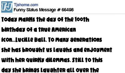 X Today marks the day of the 100th birthday of a true American icon...Lucille Ball. To many generations she has brought us laughs and enjoyment with her quirky dilemmas. Still to this day she brings laughter all over the world episode after episode of I Lov