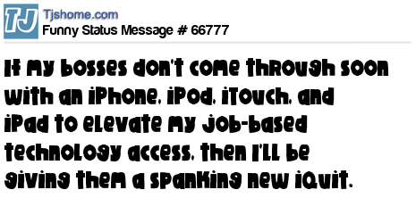 X is If my bosses don't come through soon with an iPhone, iPod, iTouch, and iPad to elevate my job-based technology access, then I'll be giving them a spanking new iQuit.