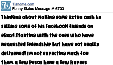 X is thinking about making some extra cash by selling some of his Facebook friends on eBay! Starting with the ones who have requested friendship but have not really delivered! I'm not expecting much for them, a few Pesos here a few Rupees there... Money's mone
