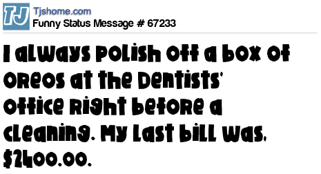 X I always polish off a box of Oreos at the Dentists' office right before a cleaning. My last bill was, $2400.00.