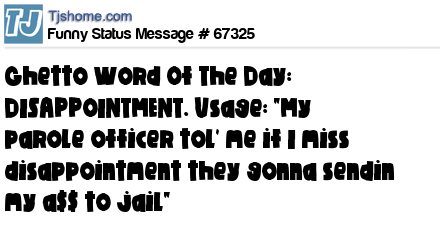 - # 86431 Ghetto word of the Day: DISAPPOINTMENT. Usage: My Parole officer said if I miss disappointment they gonna throw my ass back in jail.
