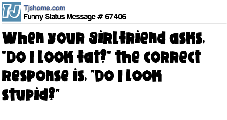 - # 77463 When your girlfriend asks you "Do I look fat?", the correct response is "Do I look stupid?"