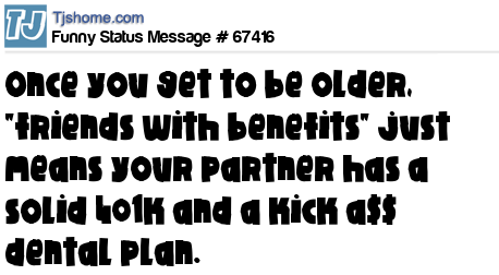 X Once you get to be older, "friends with benefits" just means your partner has a solid 401k and a kick a$$ dental plan.