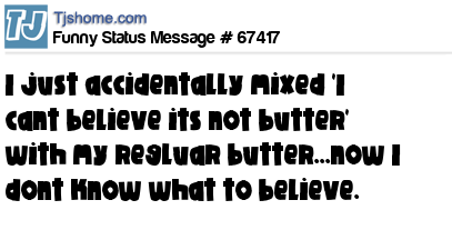 - # 67487 I just accidentally mixed 'I cant believe its not butter' with my regular butter...now I don't know what to believe