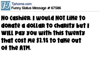 X No Cashier, I would NOT like to donate a dollar to charity but I WILL pay you with this twenty that cost me $2.95 to take out of the ATM.