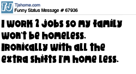 X I work 2 jobs so my family won't be homeless. Ironically with all the extra shifts I'm home less.