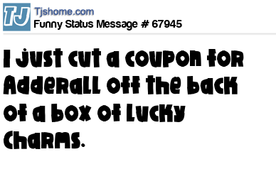 X I just cut a coupon for Adderall off the back of a box of Lucky Charms.