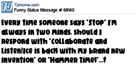X is Every time someone says "Stop" I'm always in two minds, should I respond with "Collaborate and listen/Ice is back with my brand new invention" or "Hammer Time!"...?
