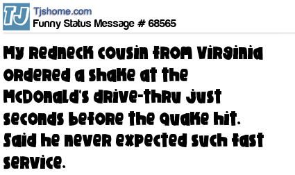 X My redneck cousin from Virginia ordered a shake at the McDonald's drive-thru just seconds before the quake hit. Said he never expected such fast service.