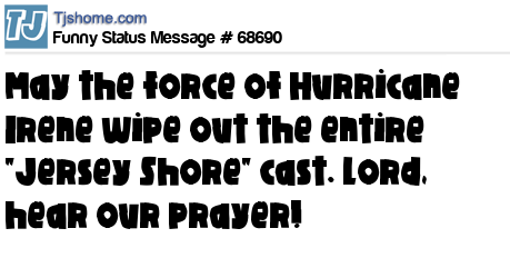 - # 68787 Dear Hurricane Irene please spare all my friends that live on the east coast, my heart and prayers go out to them, but if you make land fall in the New Jersey shore area, please take Snooki and the cast of Jersey Shore out to sea with you. Thanks' a bu