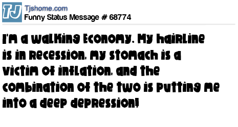 - # 91409 I'm a walking economy. My hair line is in recession, my stomach is a victim of inflation, and the combination of these factors is putting me into a deep depression.
