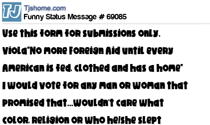 X is Use this form for submissions only. Viola"No more Foreign Aid until every American is fed, clothed and has a home" I would vote for any man or woman that promised that...wouldn't care what color, religion or who he/she slept with....PERIOD!!