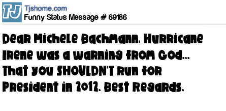 X says Dear Michele Bachmann, Hurricane Irene was a warning from God... That you SHOULDN'T run for President in 2012. Best Regards.