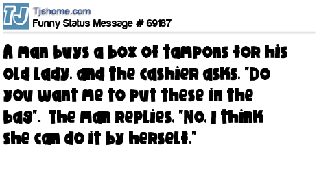 X A man buys a box of tampons for his old lady, and the cashier asks, "Do you want me to put these in the bag". The man replies, "No, I think she can do it by herself."