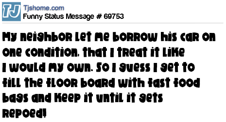 X My neighbor let me borrow his car on one condition, that I treat it like I would my own. So I guess I get to fill the floor board with fast food bags and keep it until it gets repoed!