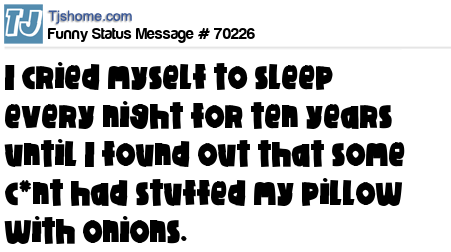 X I cried myself to sleep every night for ten years until I found out that some c*nt had stuffed my pillow with onions.