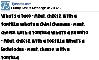 X is What's a Taco - meat, cheese, with a tortilla What's a Chimi Changas - meat, cheese, with a tortilla What's a Burrito - meat, cheese, with a tortilla What's a Enchiladas - meat, cheese, with a tortilla