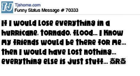 X  If I would lose everything in a hurricane, tornado, flood... I know my friends would be there for me... then I would have lost nothing... everything else is just stuff... ~R~