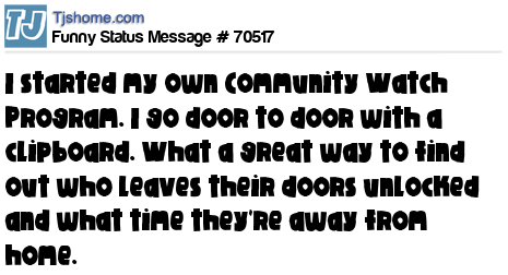 X I started my own Community Watch Program. I go door to door with a clipboard. What a great way to find out who leaves their doors unlocked and what time they're away from home.