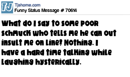 X What do I say to some poor schmuck who tells me he can out insult me on line? Nothing. I have a hard time talking while laughing hysterically.