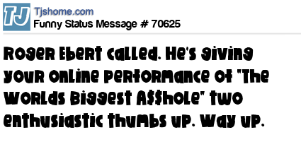 X  Roger Ebert called. He's giving your online performance of "The Worlds Biggest A$$hole" two enthusiastic thumbs up. Way up.